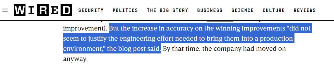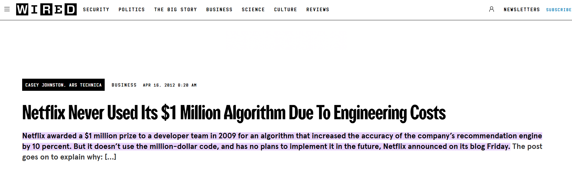 A famous real-life example comes from the Netflix Prize competition. The winning solution was an ensemble of many algorithms that achieved a 10% improvement in accuracy, yet Netflix never deployed it, since it was too complex and impractical to run at scale. Instead, a simpler approach that was easier to maintain and faster to serve users was preferred. This story is a constant reminder that as ML engineers, we must strike a balance between model complexity and practical utility.