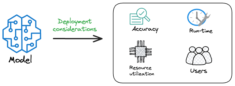 In production (e.g., a web service or mobile app), considerations like inference latency, throughput, memory footprint, and scalability become as important as raw predictive performance.