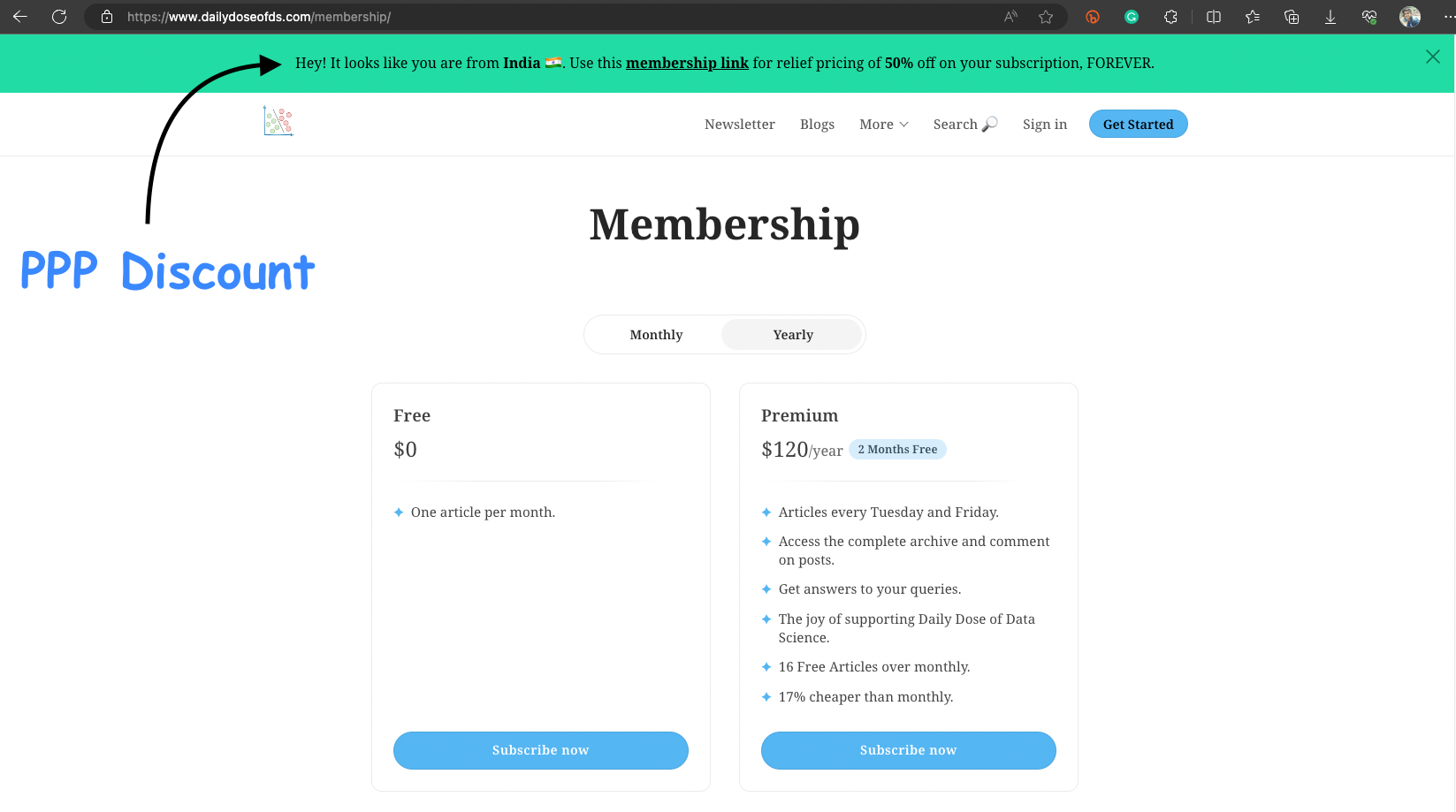 Individuals living in countries with lower purchasing power can benefit from a full subscription at a discount. To take advantage of this offer, head over to the membership page, and you'll be prompted with a relevant discount: