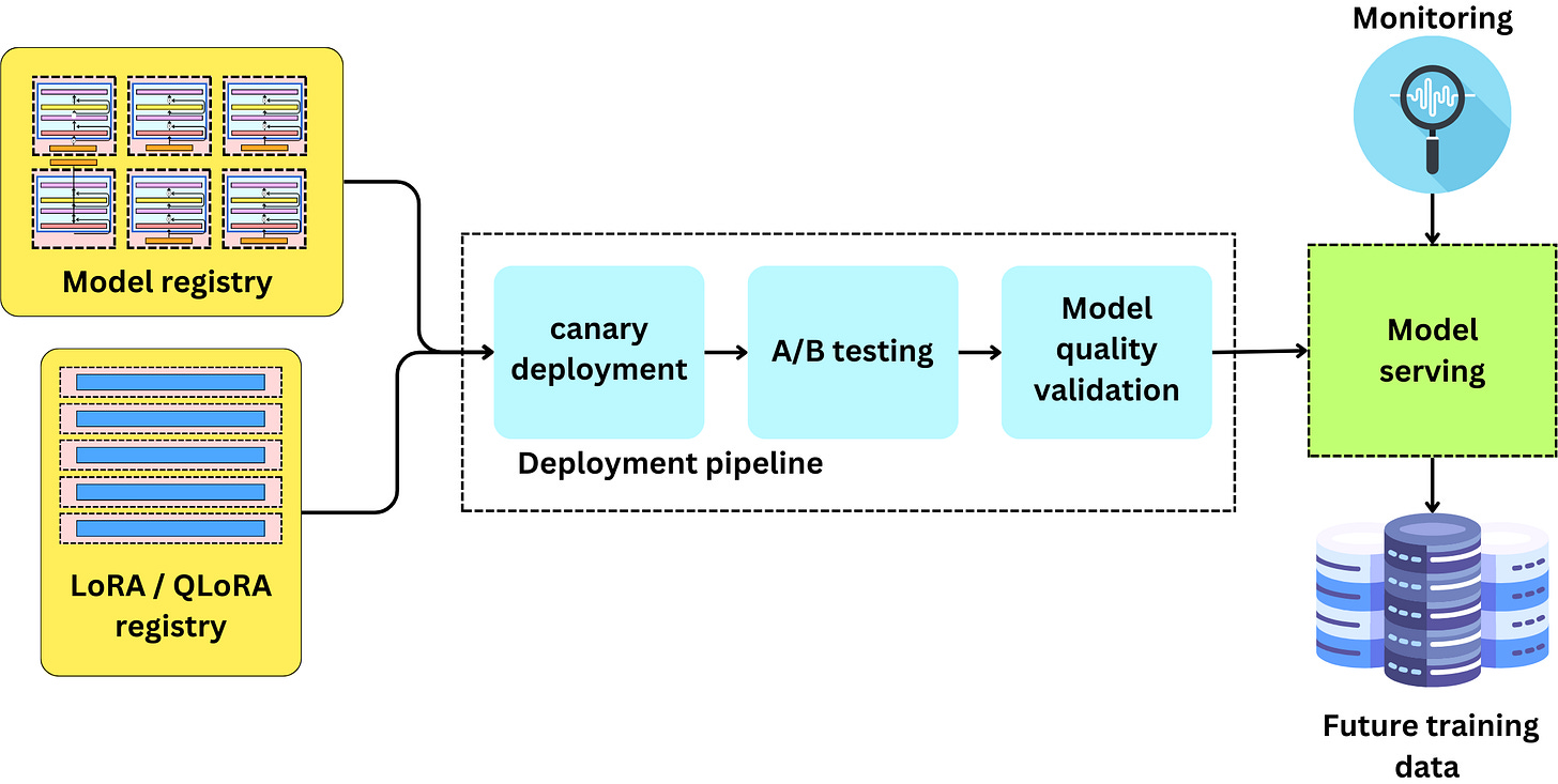 - Once ready for deployment, the model and its related LoRA / QLoRA weights are pulled from the model registry and passed through the deployment pipeline. We may have a series of tests, such as canary deployment, to make sure the model fits in a serving pipeline and an A/B test experiment to test it against the production model. After satisfactory results, we can propose the new model as a replacement for the production one.