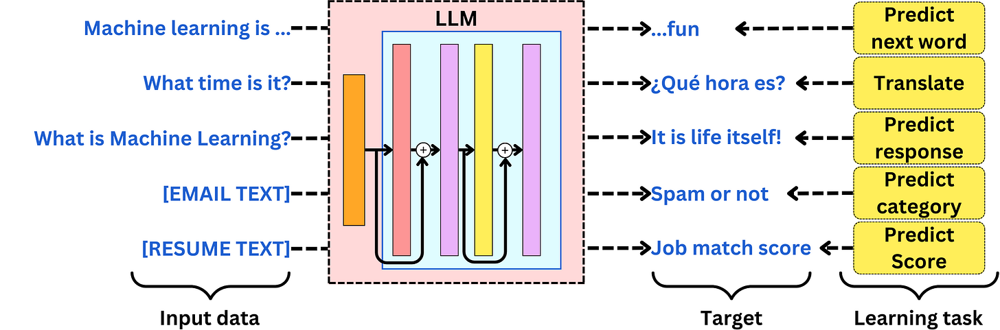 Fine-tuning assumes you will continue training an LLM on a specific learning task. For instance, you may want to fine-tune an LLM on the following tasks:
