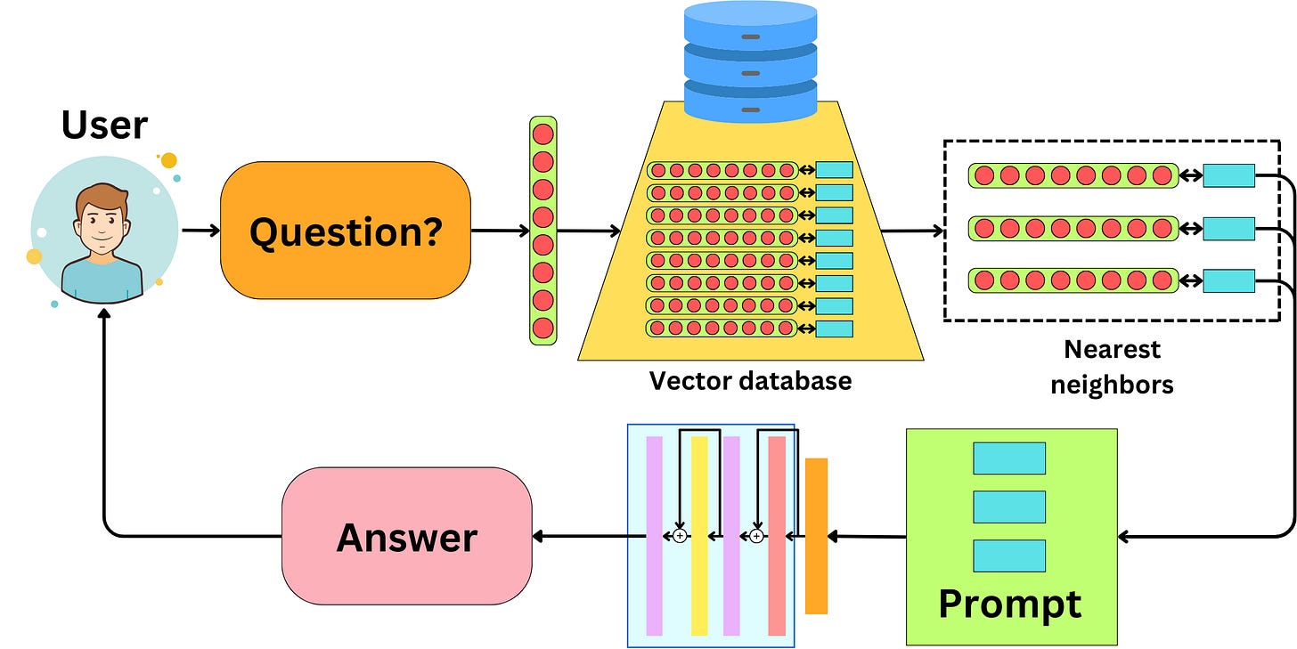 When a user asks a question, it is converted to an embedding, and we can use it to search for similar embeddings in the database. Once we find similar embeddings, we construct a prompt with the related data to provide context for an LLM to answer the question. The similarity here is usually measured using the cosine similarity metric.