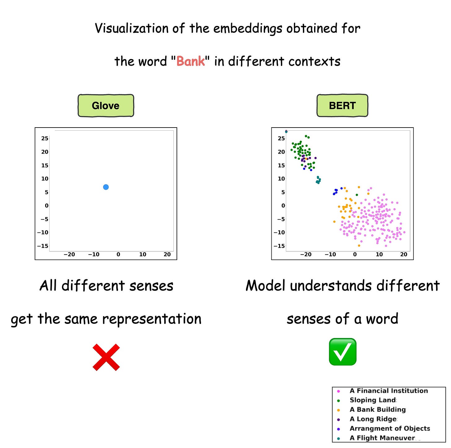 In fact, contextualized embeddings understand the different meanings/senses of the word “Bank”: