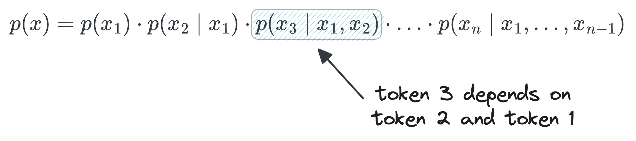 Each factor $p(x_i|x_1,\ldots,x_{i-1})$ represents the probability of the next token given everything before it. This is called the chain rule of probability, and it's mathematically exact.