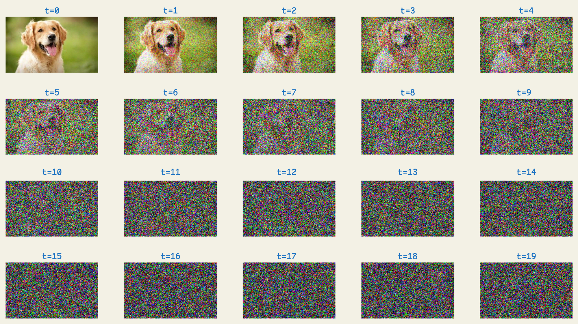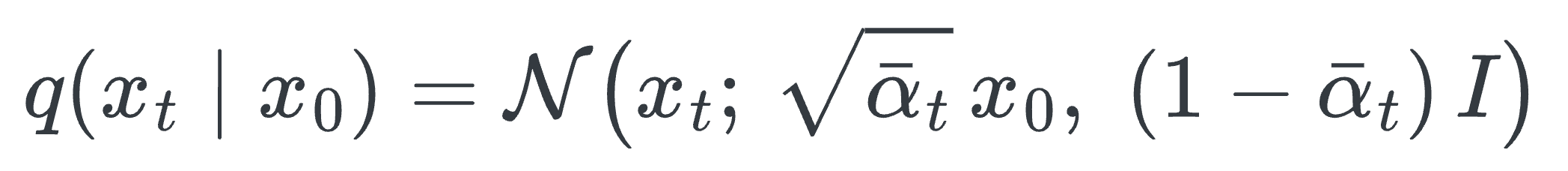 Formally, given clean data $x_0$ (the original image), the forward process at timestep $t$ produces: