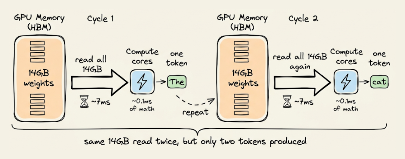 To generate a single token, the GPU needs to read those 14GB of weights from its high-bandwidth memory (HBM) into its compute cores, perform the matrix multiplications and attention computations, and produce one output token. Then, for the next token, it reads all 14GB again.