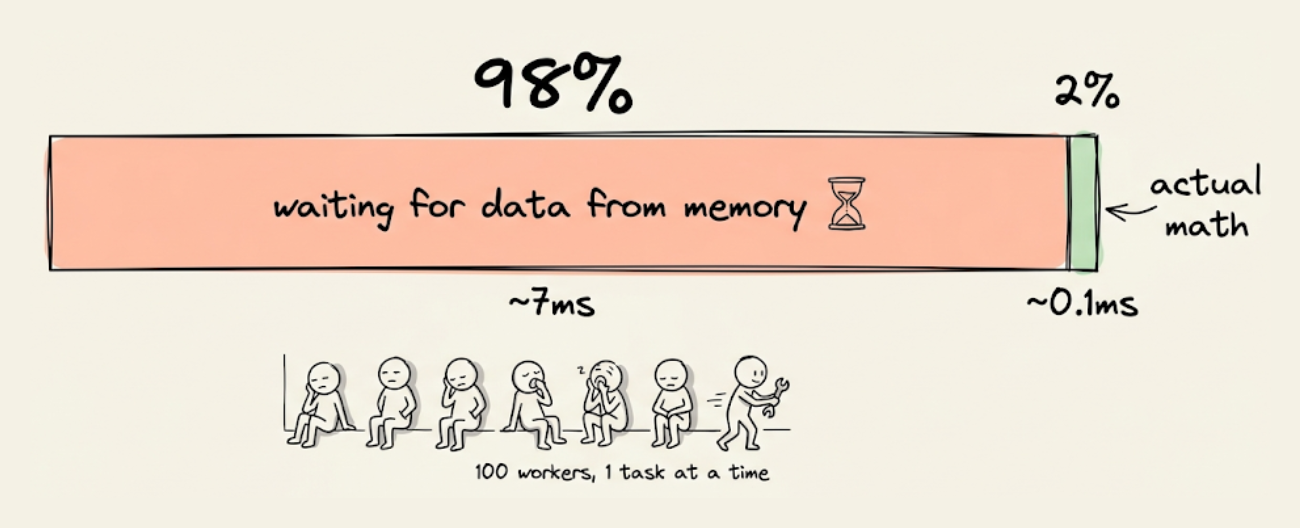 The GPU is being used at roughly 1% of its computational capacity, not because the model is small, but because the memory system can't deliver data fast enough to keep the cores busy.