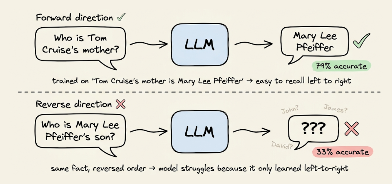 Still, for long-tail knowledge (which is most knowledge), the asymmetry is measurable and significant, and it's a direct consequence of unidirectional training.