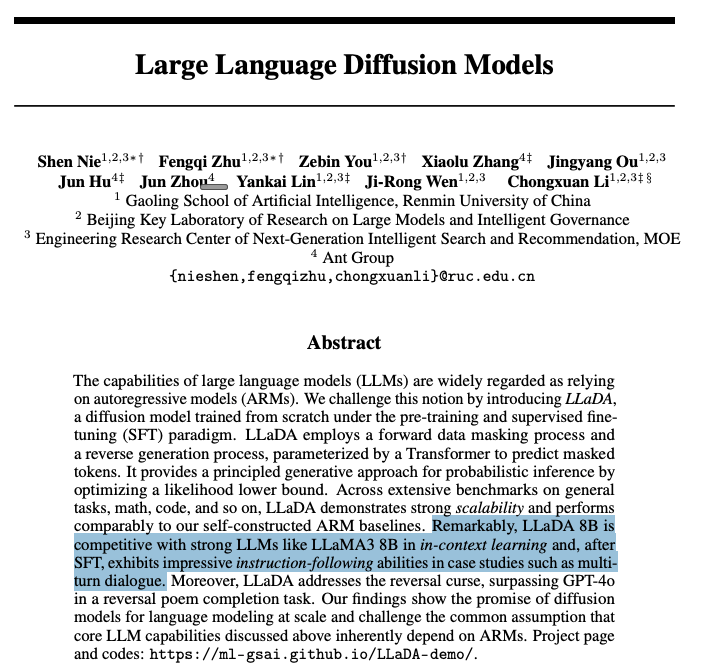 - The model also surpasses GPT-4o on a reversal poem completion task, directly demonstrating the bidirectional advantage of diffusion models. LLaDA was accepted as an oral presentation at NeurIPS 2025.