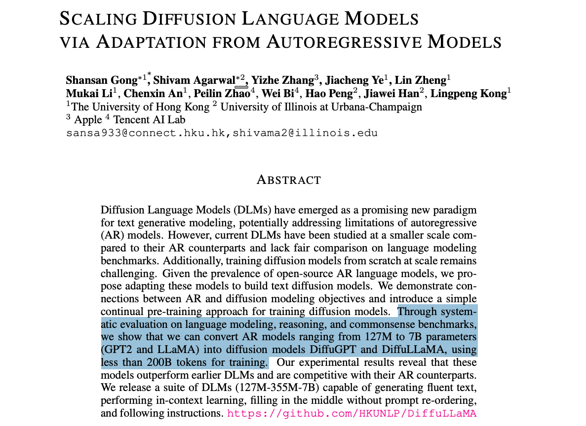 The team converted pre-trained GPT-2 models (127M and 355M parameters) and LLaMA2 (7B parameters) into diffusion models using less than 200B tokens of continual pre-training.