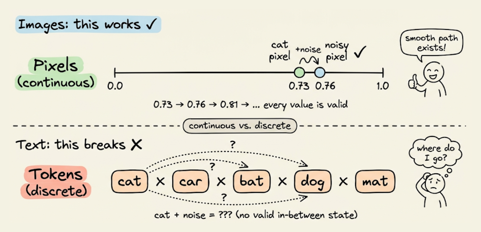 We then explored how diffusion works in images (Gaussian noise added to continuous pixel values, reversed by a denoising network) and why that approach breaks for text (tokens are discrete, you cannot add a tiny amount of noise to "cat" and get something meaningful).