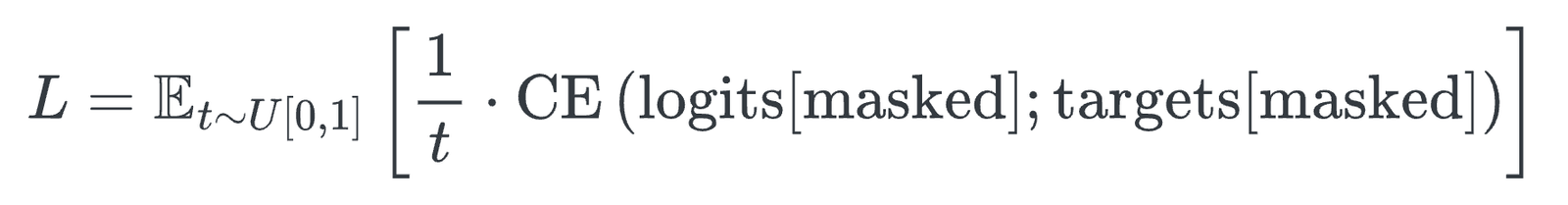 - The model transitions from next-token prediction to the masked diffusion objective (variable masking rate with ELBO-derived weighting).
