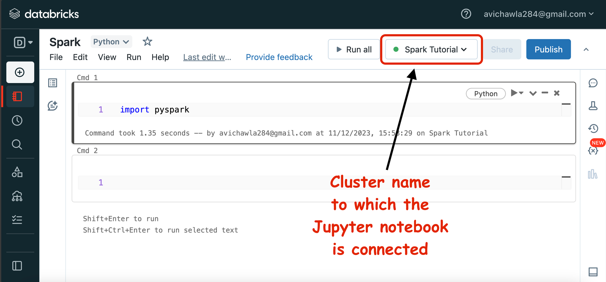 The notebook also shows the cluster to which our Jupyter Notebook is connected to.