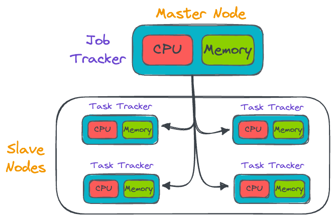 The master node (also called the job tracker) distributes the code/task that the slave node (also called the task tracker) must run.