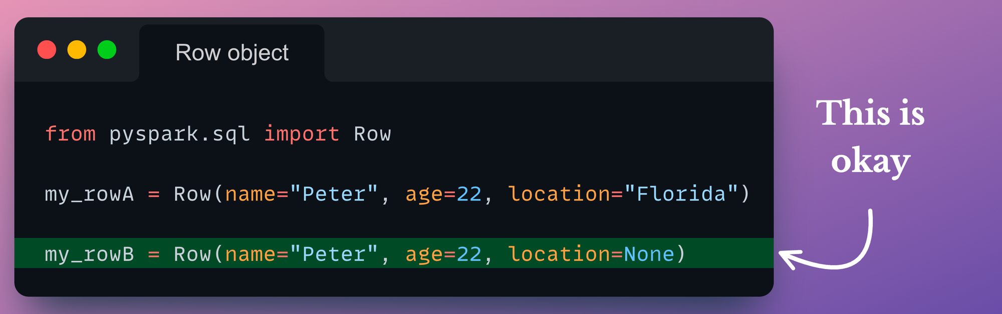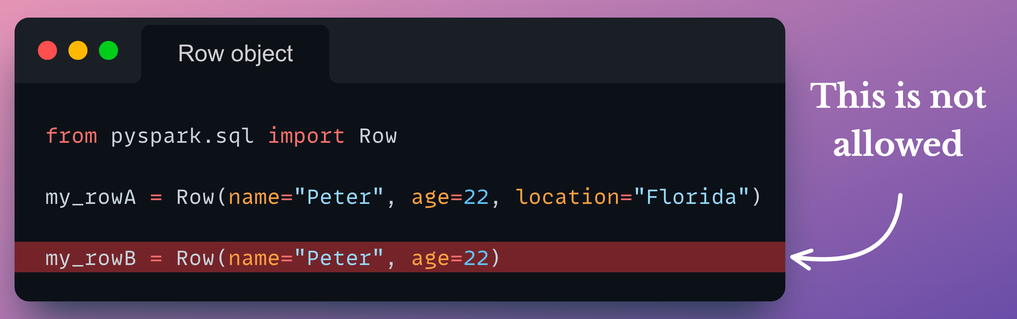 Of course, the my_rowB object can exist as a standalone Row object, but the point is that my_rowB and my_rowA cannot be combined into the same DataFrame at a later point. We will also verify this shortly.