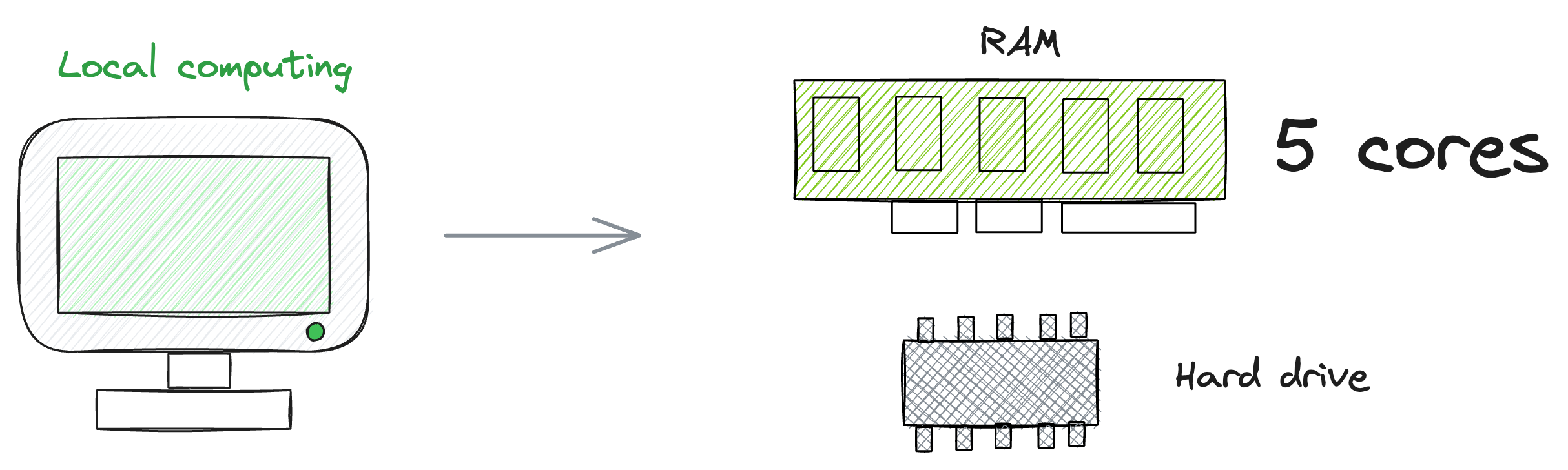 For instance, as illustrated in the diagram, a local machine might have, for instance, five cores.