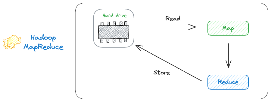 Simply put, Hadoop MapReduce reads the data from the disk for each stage of processing and stores the data on the disk after every Map and Reduce step.
