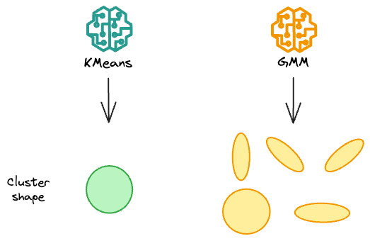 Simply put, in 2 dimensions, while KMeans only create circular clusters, gaussian mixture models can create oval-shaped clusters.