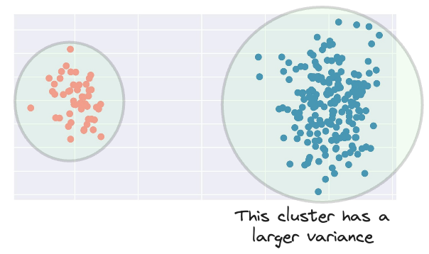 As KMeans is all about placing circles, its results aren’t ideal when the dataset has irregular shapes or varying sizes, as shown below: