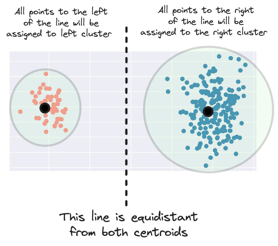 This means that it creates a margin for assigning a new data point to a cluster that is equidistant from both centroids.