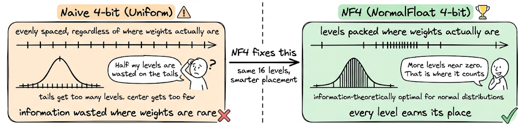 Not all 4-bit representations are equal. A naive approach would space the 16 possible values (that 4 bits can represent) uniformly across the weight range. But neural network weights are not uniformly distributed. They tend to follow a roughly normal distribution. NF4 (NormalFloat 4-bit) exploits this.