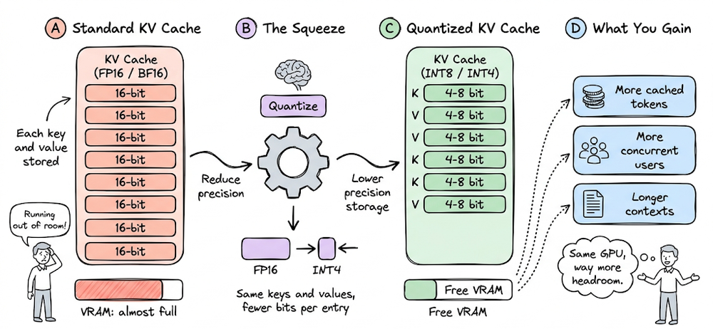 We also saw that KV cache quantization can further reduce memory footprint and enable larger batch sizes or longer contexts.