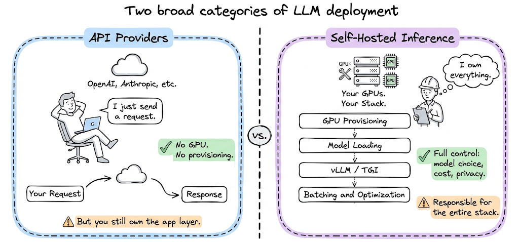 - API providers (OpenAI, Anthropic, etc.): These are inference services. You send a request, you get a response. You do not manage hardware, you do not worry about GPU provisioning, and you do not implement optimizations. The provider handles all of that. However, you still need to manage your application layer.