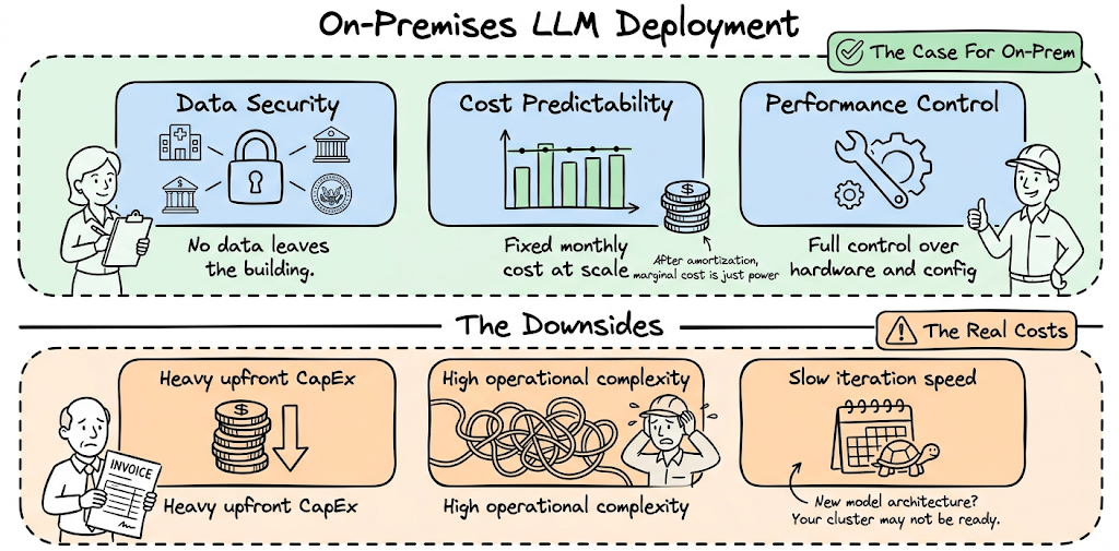 Teams choose on-prem LLM deployments primarily for three reasons: data security and compliance, predictable cost at scale, and performance control.