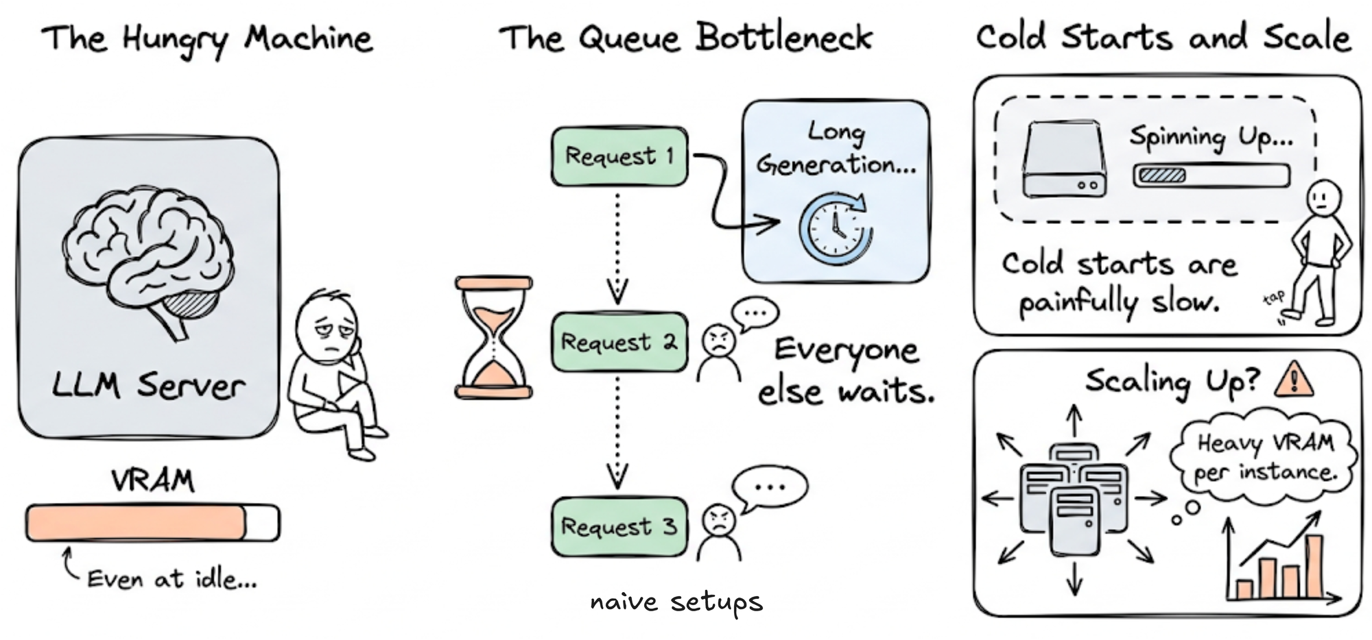 LLMs are resource-intensive, often consuming significant VRAM even when idle. In naive setups, requests might be handled sequentially, meaning a single long-running generation can block all subsequent users. Cold starts are slower, and scaling is more complex due to the heavy compute and memory requirements.