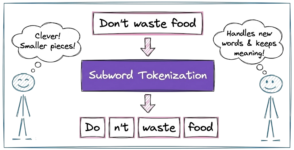 Unlike single characters, subword tokens can represent meaningful chunks of words. For instance, the word “cooking” can be split into tokens “cook” and “ing”, each carrying part of the meaning.