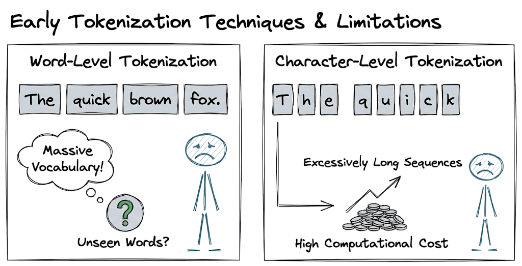 Early techniques relied on word-level tokenization (splitting by spaces) or character-level tokenization. Both approaches have significant limitations.
