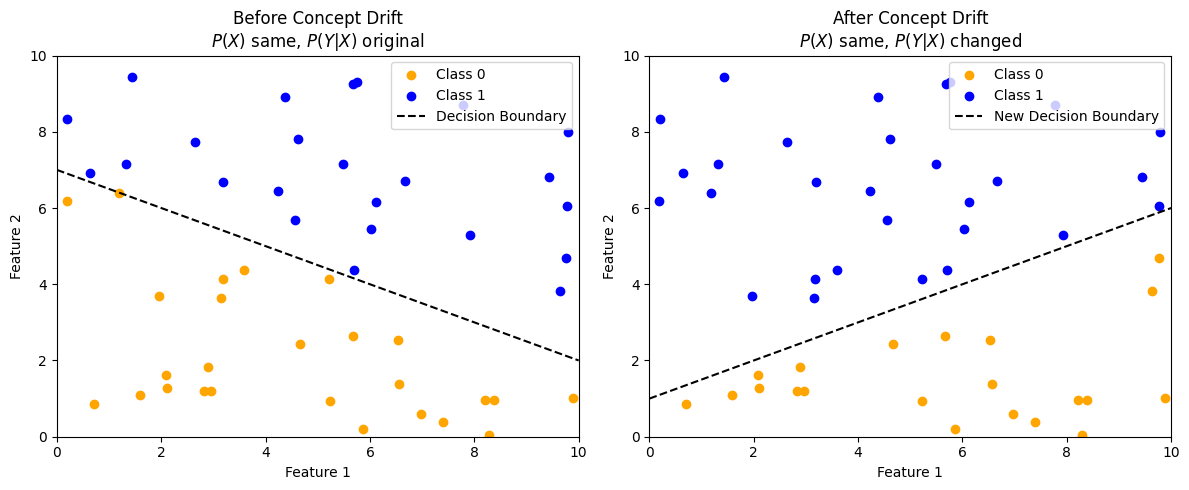 For instance, in the two plots below, both features span the same range of values before (feature 1 ranges from [0, 10] and feature 2 ranges from [2, 10]) and after drift (feature 1 ranges from [0, 10] and feature 2 ranges from [2, 10]), but the mapping has changed: