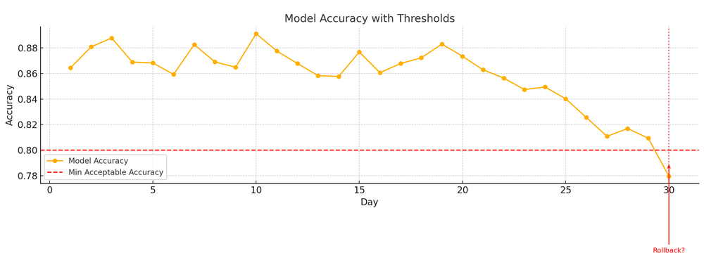 In practice, teams define "failure thresholds", e.g., if the new model’s AUC drops 5 points below the current production model, do not promote it.