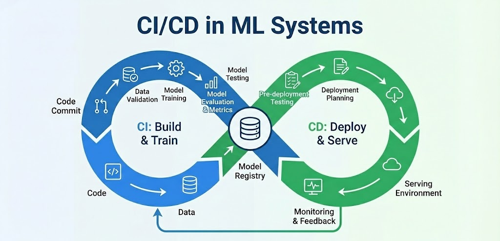 Traditional CI/CD focuses on delivering code changes quickly and safely. With ML, we need to extend this idea to data and models too.