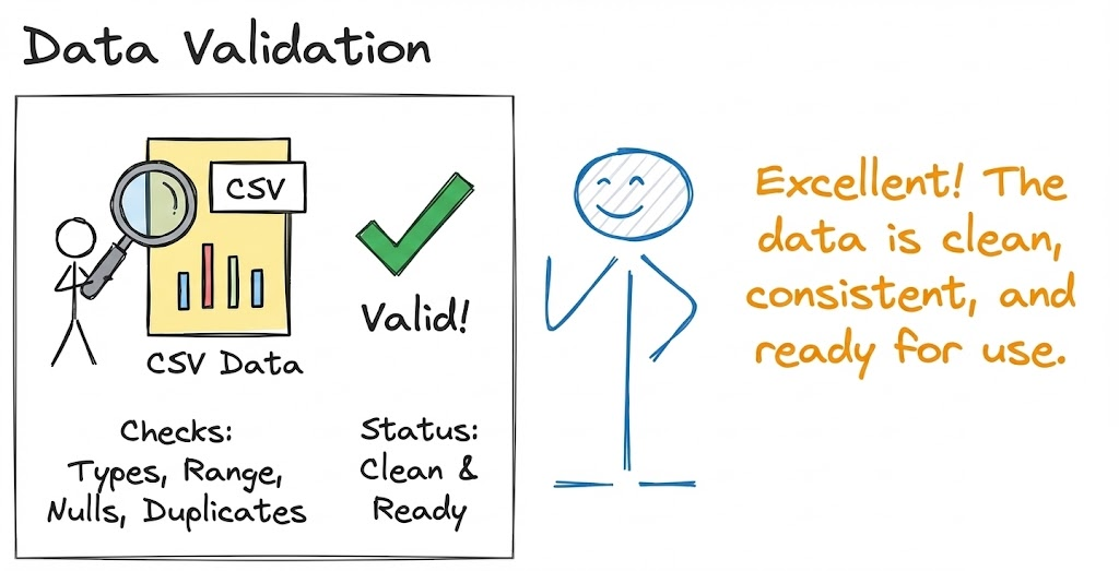 If the data passes all checks, the script simply prints that validation succeeded.