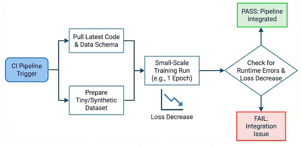 This can catch issues like misaligned tensor dimensions, incompatible data types, or broken training scripts that unit tests might miss.