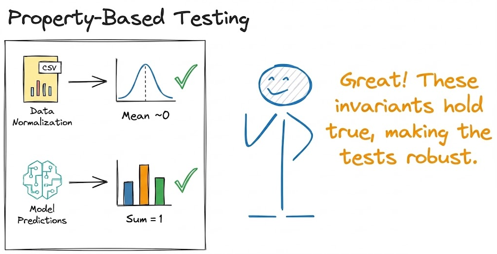 For example, if adding more data should not reduce the length of the output, test for that. If a function is supposed to normalize data, test that the mean of output is ~0. If the sum of the model’s prediction probabilities should sum to 1, test that property. These are more robust than testing for an exact prediction value.