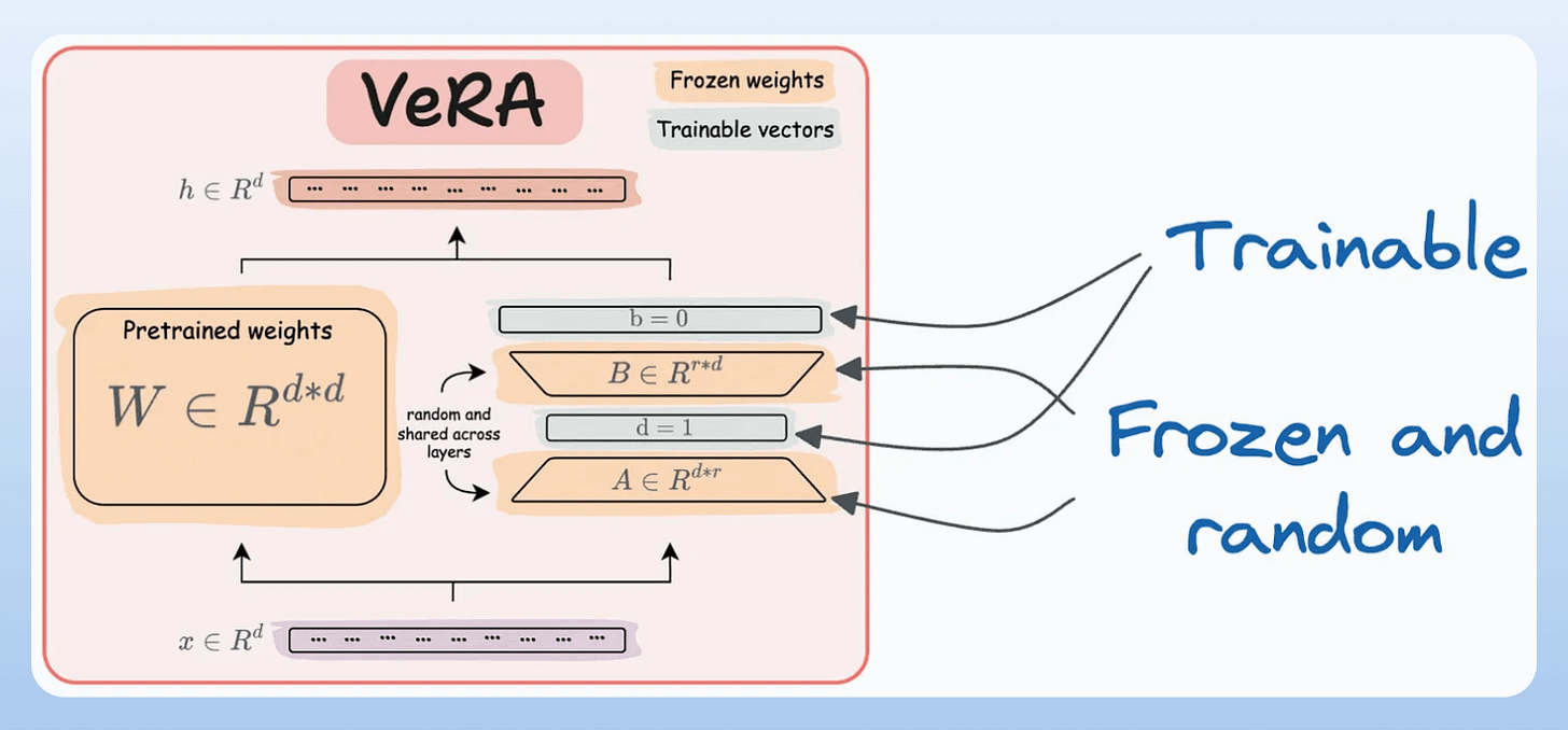 A and B, and both matrices are trained. In VeRA, however, matrices A and B are frozen, random, and shared across all model layers. VeRA focuses on learning small, layer-specific scaling vectors, denoted as b and d, which are the only trainable parameters in this setup.