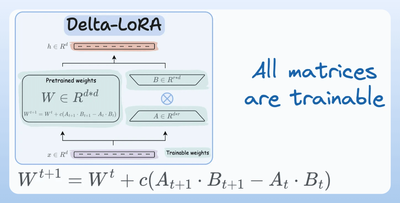 A and B alongside weight matrices, which contain the trainable parameters. Instead of fine-tuning W, adjust the updates in these low-rank matrices.