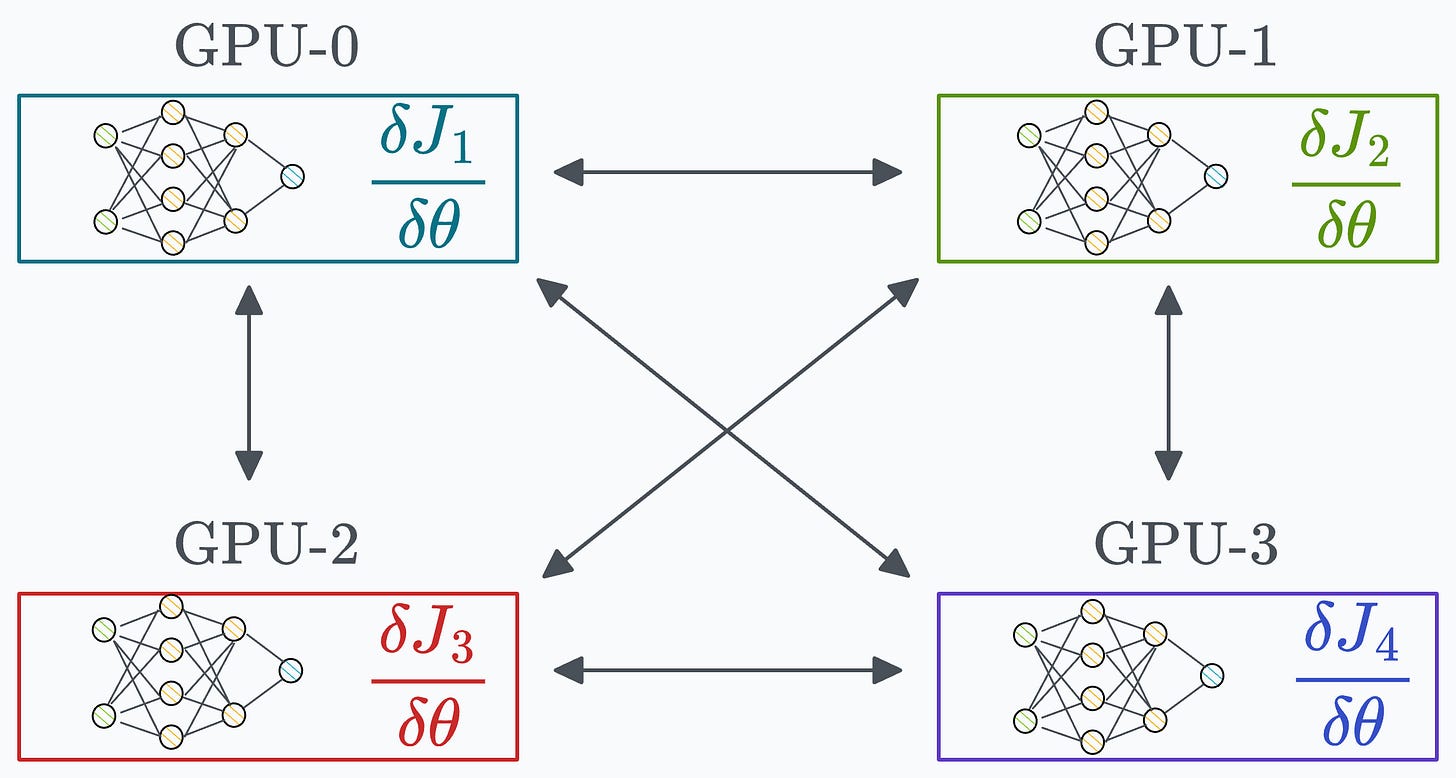 Thus, before updating the model parameters on each GPU device, we must communicate these gradients to all other devices.