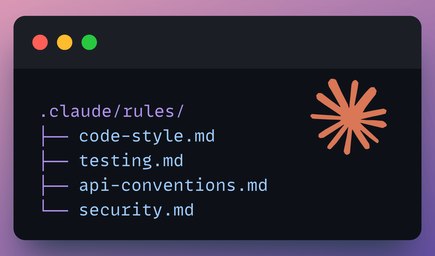 Every markdown file inside .claude/rules/ gets loaded alongside your CLAUDE.md automatically. Instead of one giant file, you split instructions by concern: