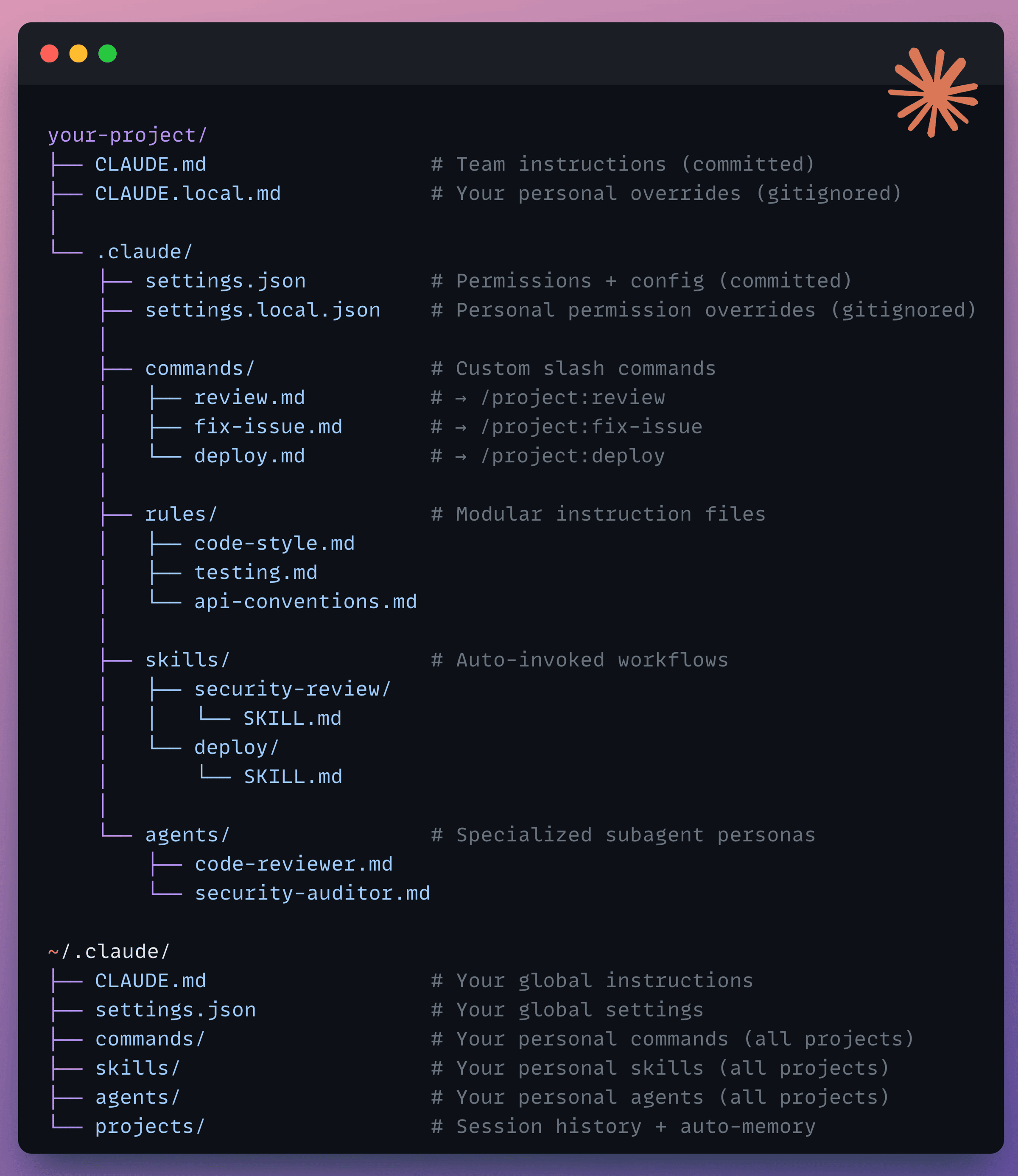 The project-level folder holds team configuration. You commit it to git. Everyone on the team gets the same rules, the same custom commands, the same permission policies.