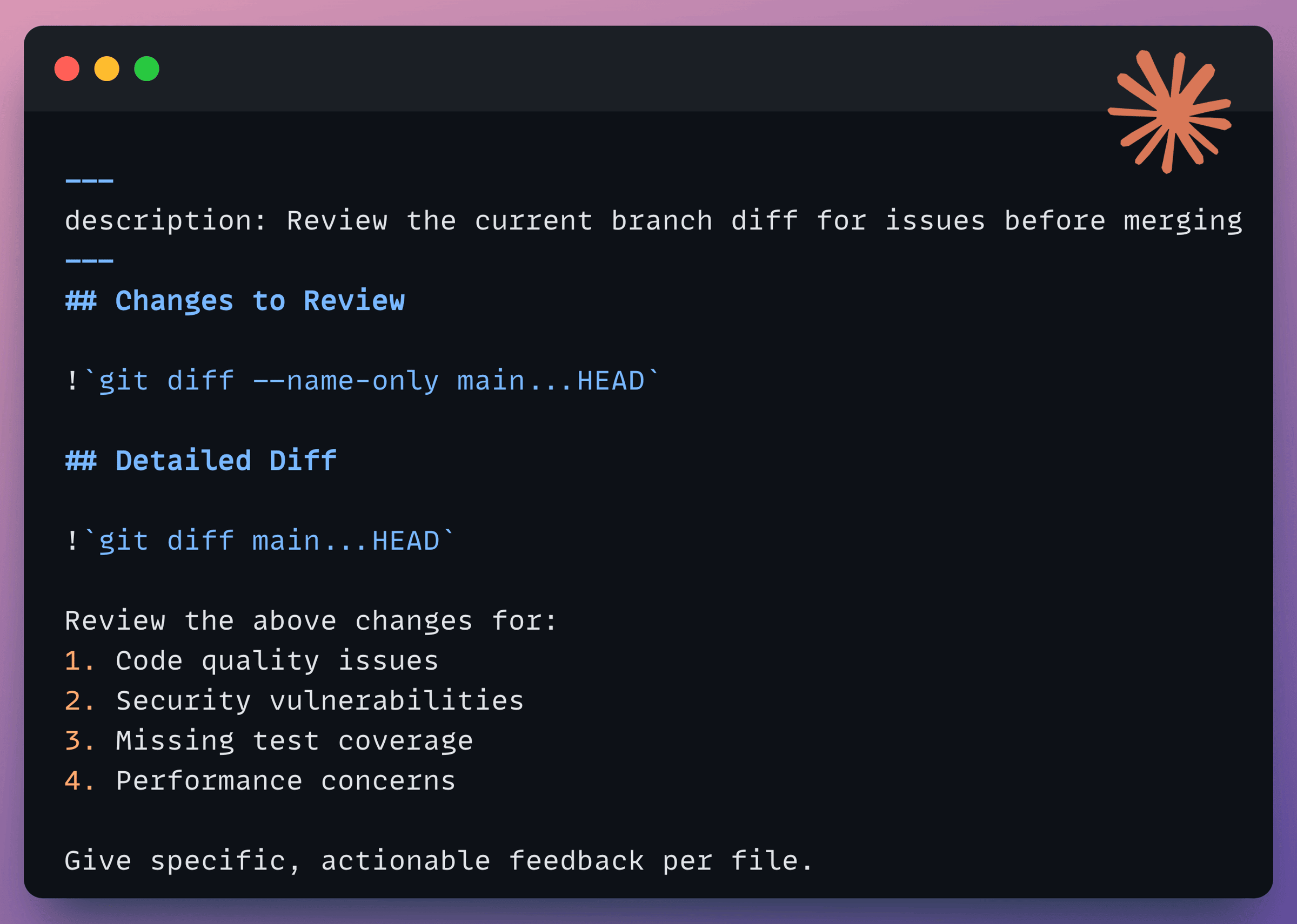 Now run /project:review in Claude Code and it automatically injects the real git diff into the prompt before Claude sees it. The ! backtick syntax runs shell commands and embeds the output. That’s what makes these commands genuinely useful instead of just saved text.