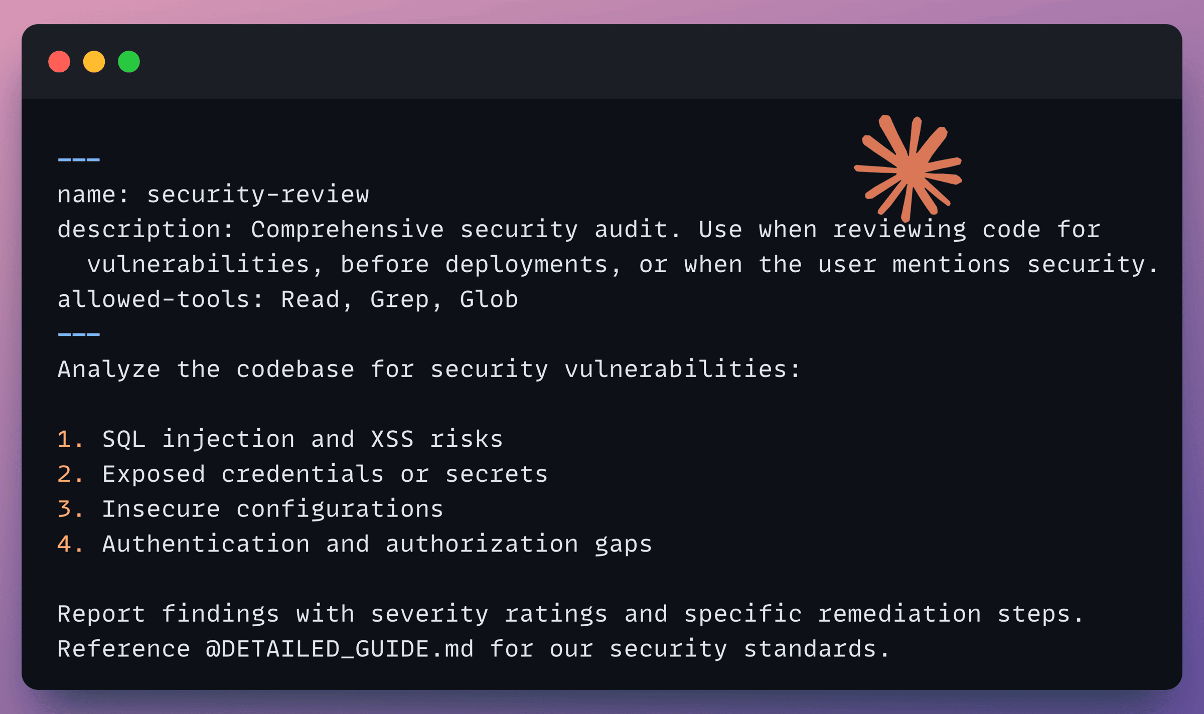 When you say “review this PR for security issues,” Claude reads the description, recognizes it matches, and invokes the skill automatically. You can also call it explicitly with /security-review.