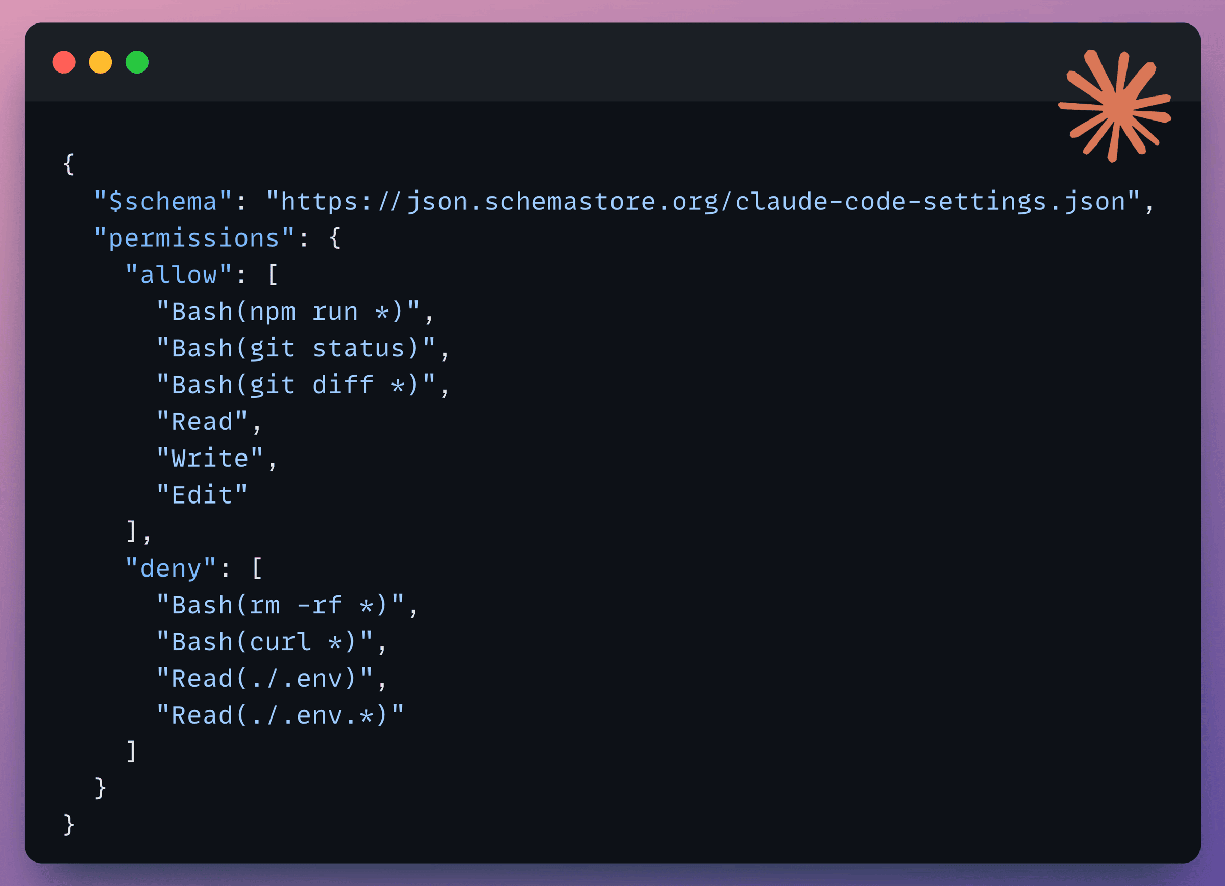 Bash(npm run *) or Bash(make *) so Claude can run your scripts freelyBash(git *) for read-only git commandsThe deny list contains commands that are blocked entirely, no matter what. A sensible deny list blocks: