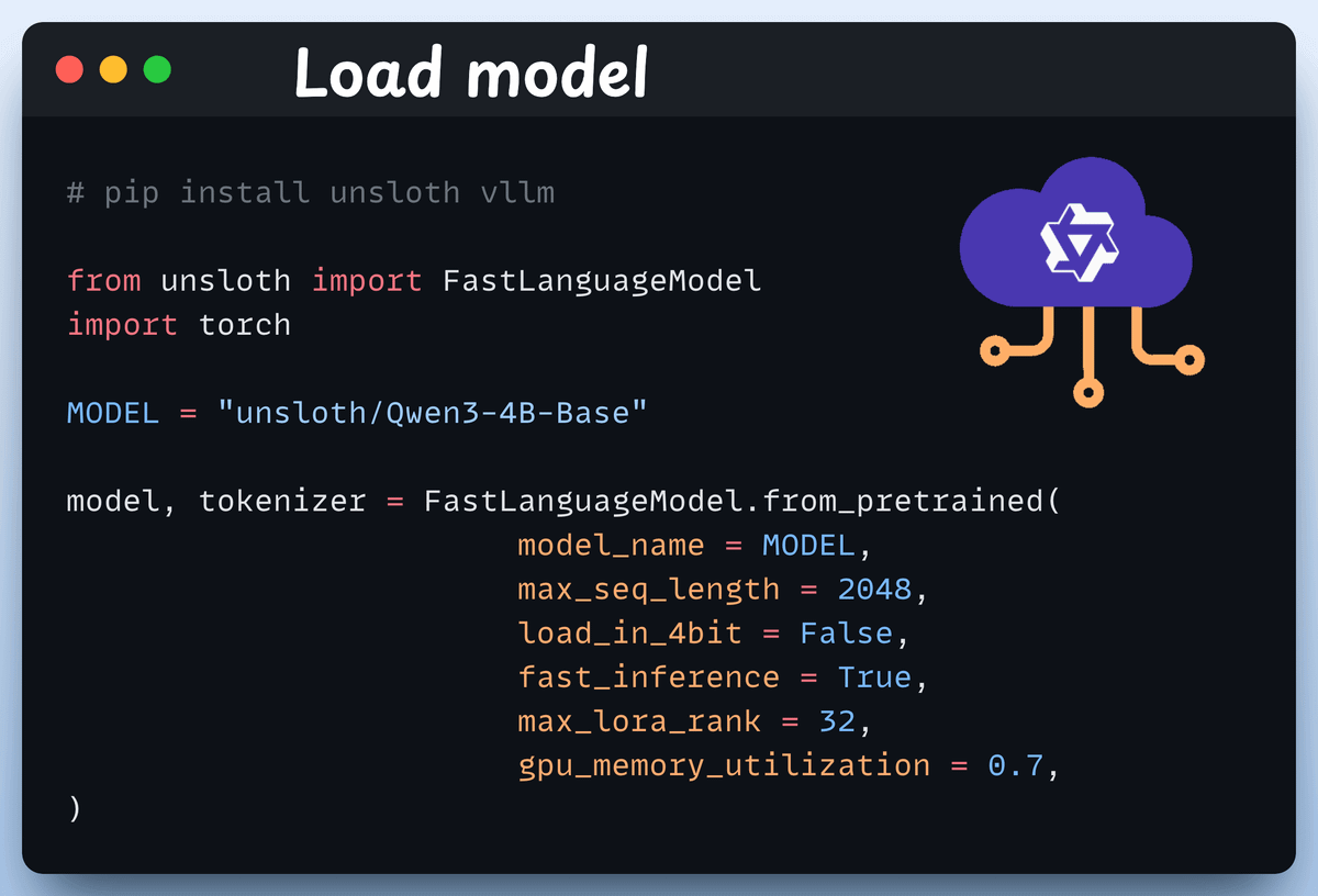 We start by loading Qwen3-4B-Base and its tokenizer using Unsloth.