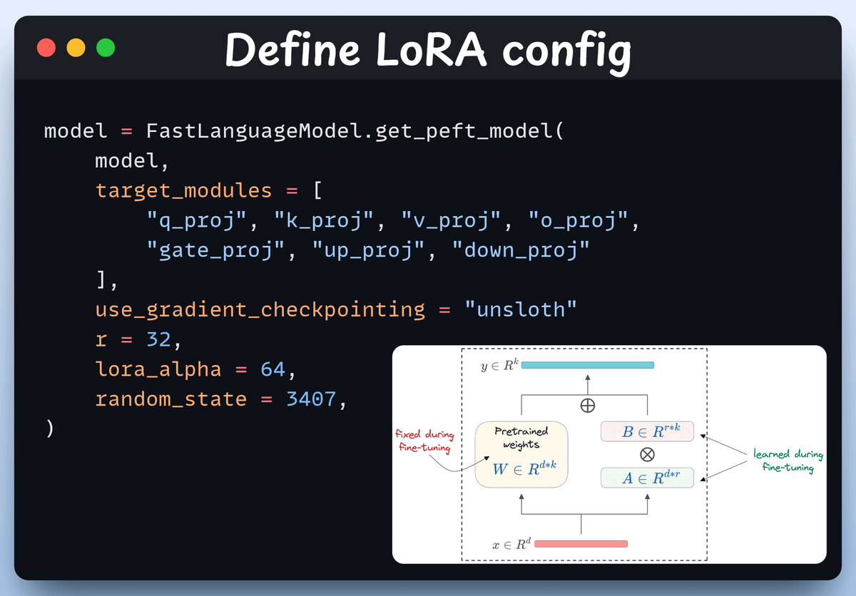 We'll use LoRA to avoid fine-tuning the entire model weights. In this code, we use Unsloth's PEFT by specifying: