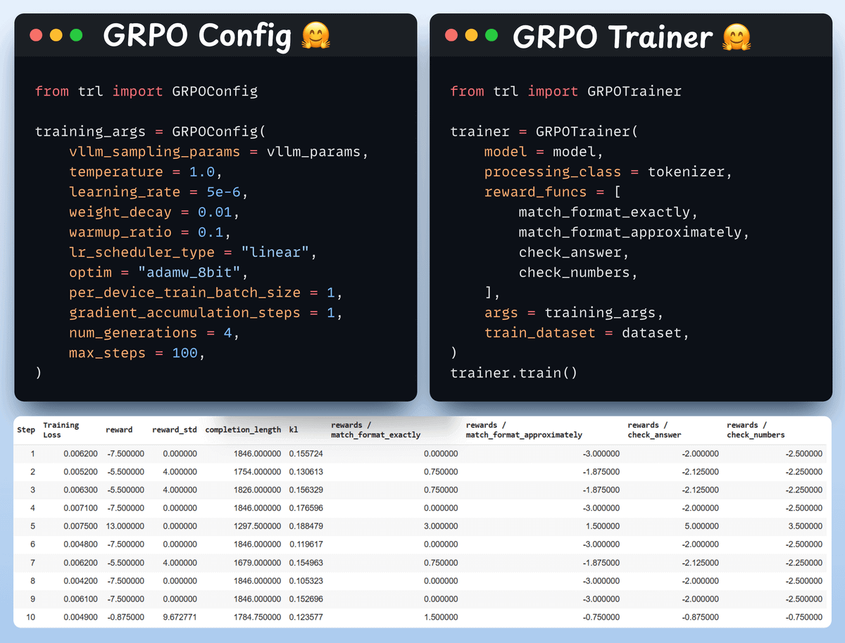 HuggingFace TRL provides everything we described in the GRPO diagram, out of the box, in the form of the GRPOConfig and GRPOTrainer.