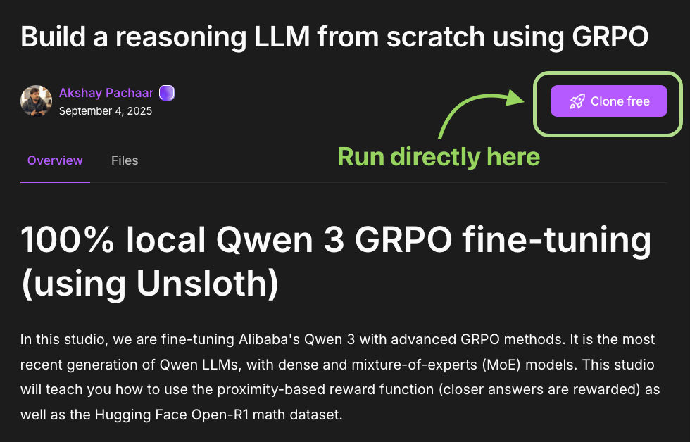 The code is available here: Build a reasoning LLM from scratch using GRPO. You can run it without any installations by reproducing our environment below: