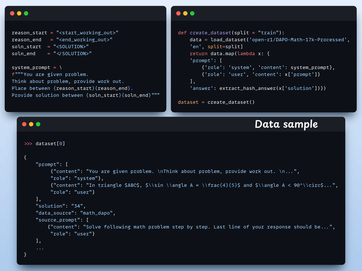 We load the Open R1 Math dataset (a math problem dataset) and format it for reasoning.